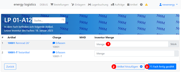 In der Zählansicht müssen jetzt alle am Lager befindlichen Mengen (1) eingetragen werden. Hat ein Artikel keinen Bestand, muss unbedingt eine 0 eingetragen werden. Der Artikel wird dann automatisch ausgebucht. Soll ein Artikel hinzugefügt werden kann dies in der Maske für Artikel hinzufügen (2) erfolgen. Ist das Fach komplett fertig gezählt, ist der Button Fach fertig gezählt (3) zu drücken.