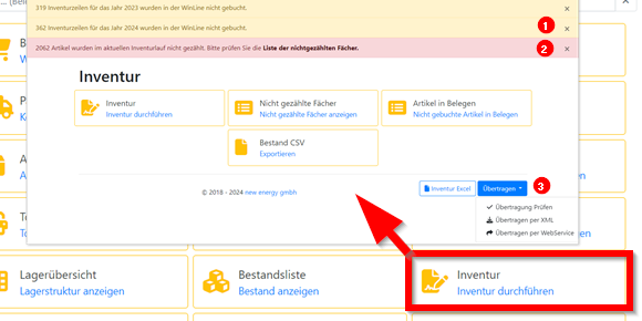 Wurden alle Fächer gezählt kann die Inventur an die WinLine übermittelt werden. Wichtig ist es darauf zu achten, dann auch alle am Lager befindlichen Artikel gezählt wurden. Die nicht gezählten Artikel werden als Warnhinweis (2) angezeigt. Wurden in der Vergangenheit bereits Inventurdaten an die WinLine übermittelt, wird die Anzahl der nicht gebuchten Zeilen (1) angezeigt. Sind alle Artikel gezählt, kann die Inventur an die WinLine mit klick auf den Button Alle Übertragen (3) übermittelt werden. Dieser Vorgang kann je nach Anzahl der Artikel mehrere Minuten dauern.