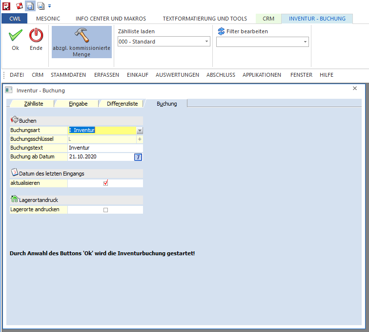 Es ist darauf zu achten die Inventurbuchung mit der Buchungsart I (Inventur) durchzuführen. Außerdem ist es wichtig, beim Buchen zu entscheiden, ob die kommissionierten Waren mit gezählt wirde oder nicht. Beim Buchen muss dann der Button “abzgl. kommissionierte Menge” aktiviert werden.
