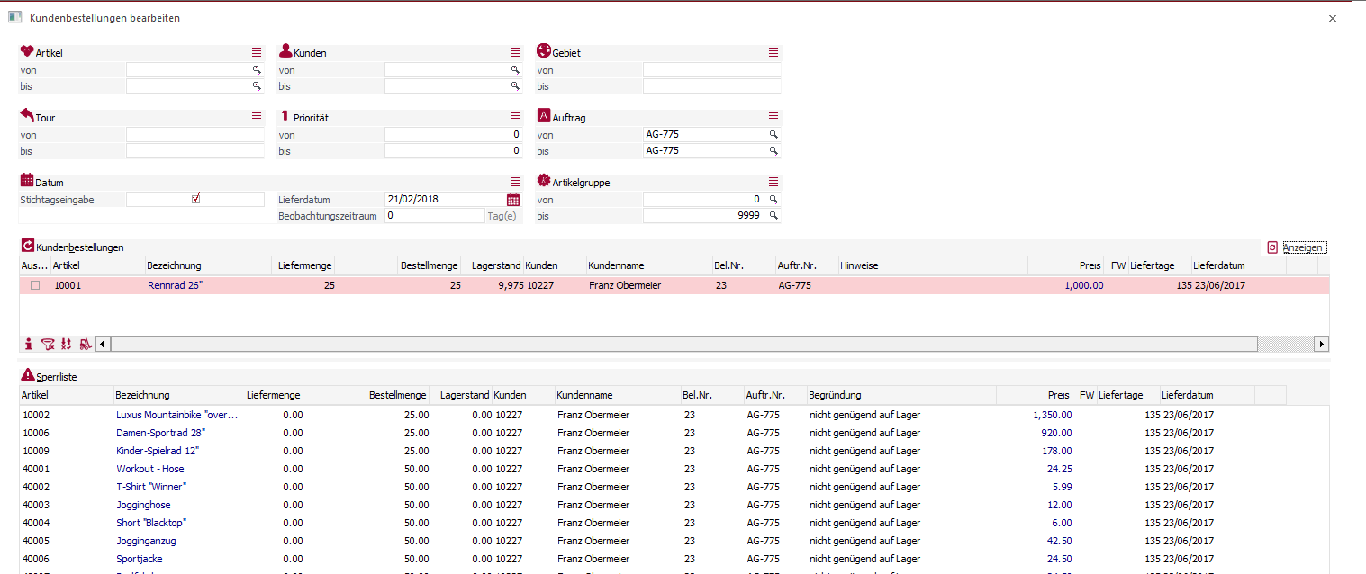 Dort unter Auftrag die Auftragsnummer eingeben oder einen Bereich. Wenn Auftrag leer bleibt werden alle Belegmitten angezeigt. Dann auf den Knopf (rechts in der Mitte) Anzeigen drücken. Jetzt werden alle Positionen des Beleges angezeigt. Oben die Positionen mit Bestand und unten ohne.