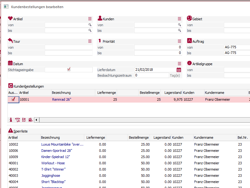 Die Freigabe des Packauftrags für das Lager erfolgt über das Modul Kundenbestellungen bearbeiten. Die Entscheidung welcher Kunde welche Ware erhält wird von der Auftragserfassung entkoppelt, nur so kann das “große Ganze” betrachtet werden.
