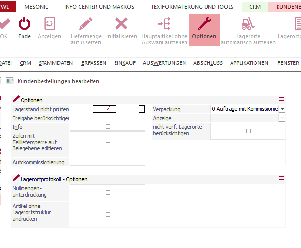 Folgende Optionen können in Kdbst. bearbeiten verwendet werden. 1. 0 - Aufträge mit Kommissionierung bzw. gedruckter Packliste nicht anzeigen. Auftragszeilen die der User oder ein Kollege freigegeben hat, werden somit nicht erneut angezeigt und können nicht versehentlich überschrieben werden. 2. 2 - inkl. Aufträge mit Kommissionierung bzw. gedruckter Packliste. Es werden alle Auftragszeilen angezeigt. Somit können bereits gedruckte Zeilen bearbeitet aber auch versehentlich überschrieben werden.