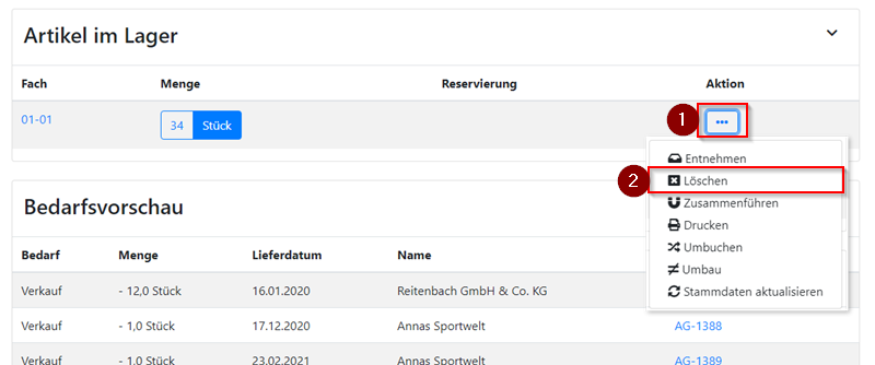 nur von Administratoren durchgeführt werden und findet sich in der Artikel-Infoansicht unter dem Menüpunkt Löschen.